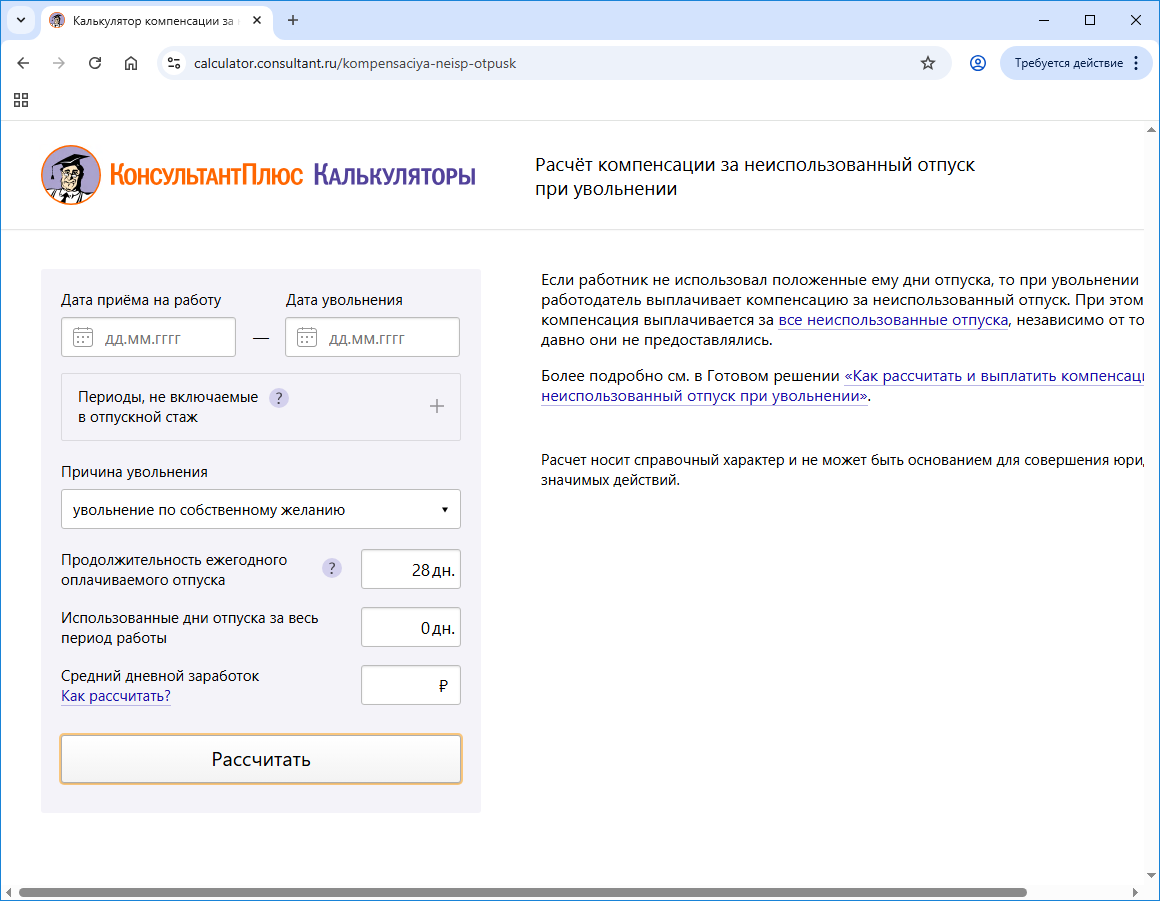 - Калькуляторы: сервис помогает кадровику рассчитать дни отпуска для исчисления отпуска, компенсацию при увольнении. Чтобы система сделала все необходимые расчеты, нужно заполнить все поля;