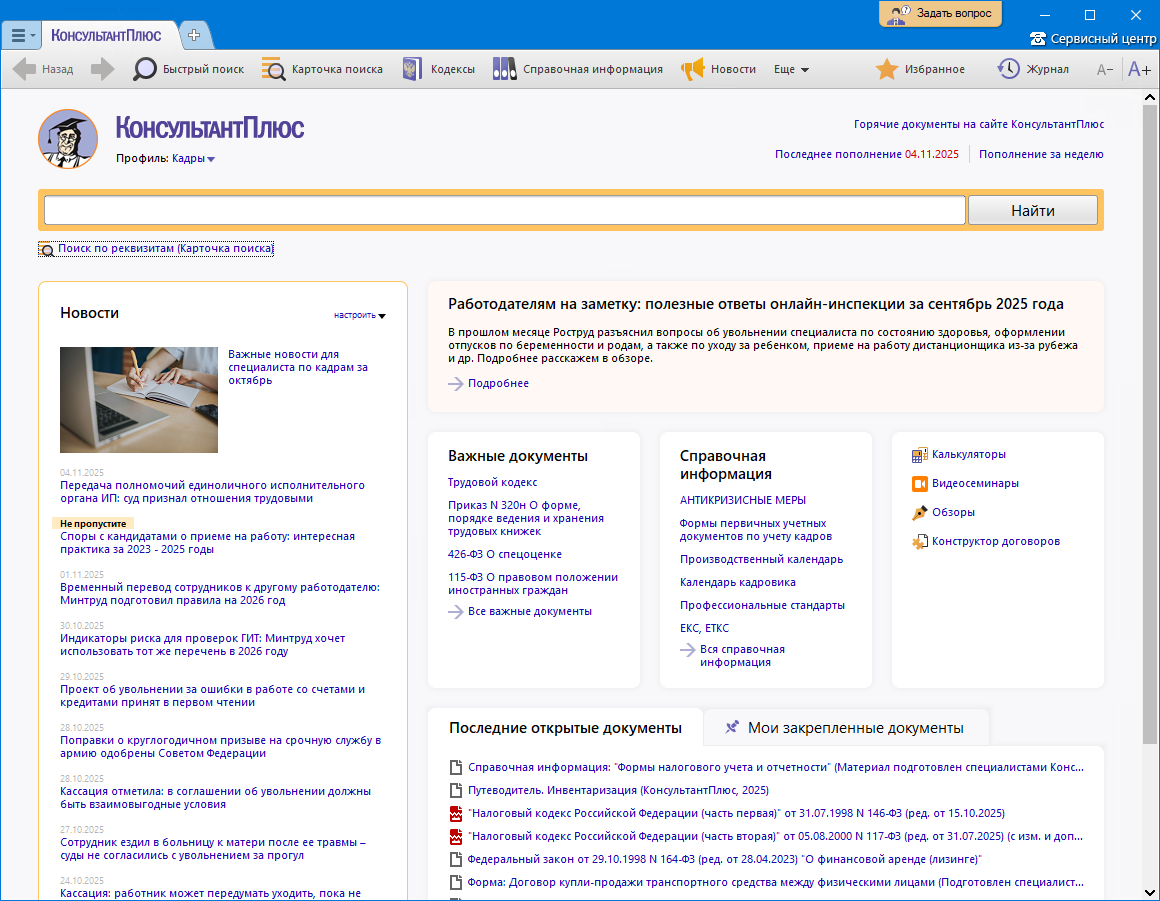 В повседневной работе специалиста по кадрам возникает множество задач: прием на работу, заполнение трудовых книжек, оформление отпусков и командировок, увольнение. Решить все эти вопросы поможет СПС Консультант Плюс. Профиль «Кадры» поможет настроить стартовую страницу и поиск в системе под конкретного специалиста.