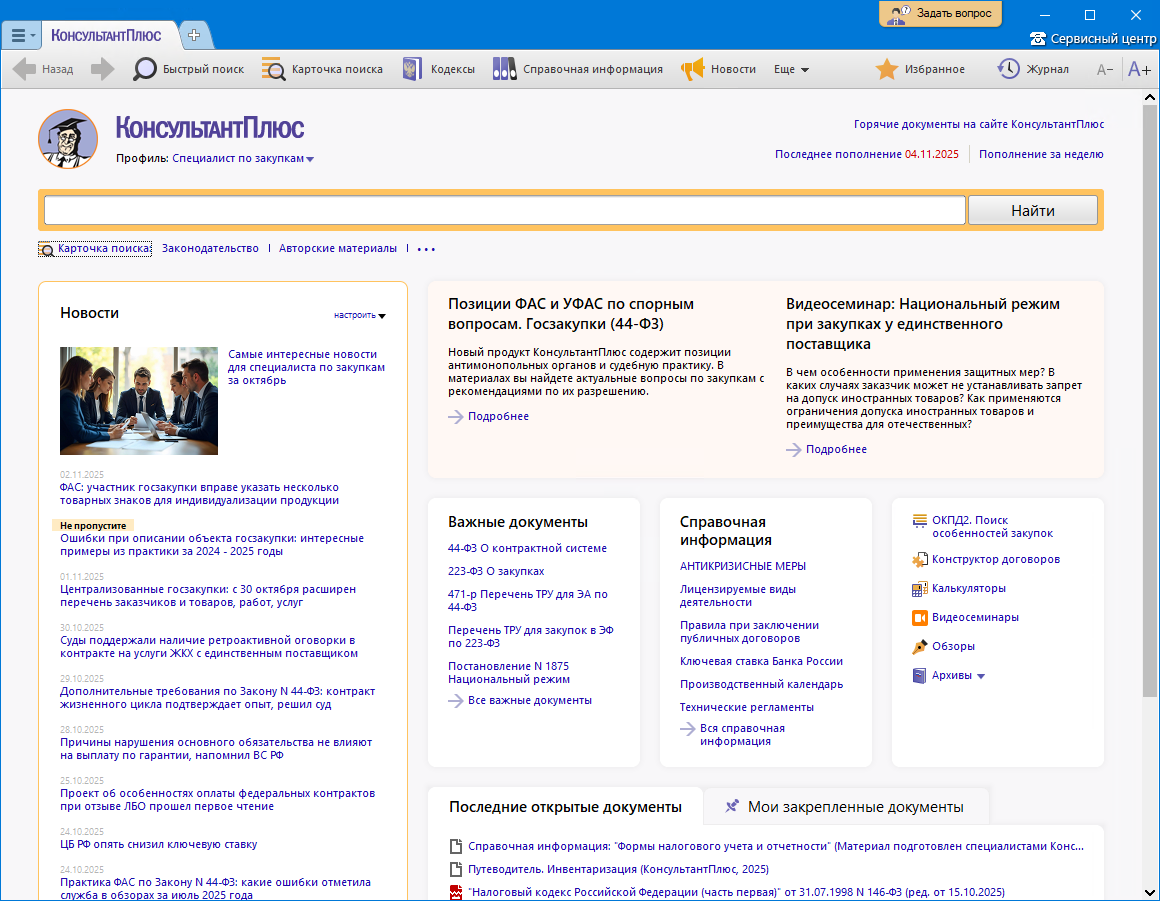 Специалисту по закупкам в работе требуется актуальная информация о проведении процедуры. В СПС КонсультантПлюс представлены законы в сфере закупок, разъяснения по их проведению, спорные вопросы и отраслевые новости. В профиле «Специалист по закупкам» можно настроить главную страницу и поиск с учетом запросов конкретного пользователя.