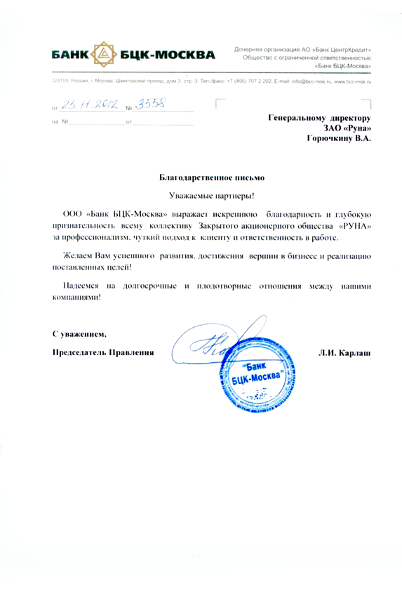 ООО «Банк БЦК-Москва» Выражает искреннюю благодарность и глубокую признательность всему коллективу Закрытого акционерного общества «РУНА» за профессионализм, чуткий подход к клиенту и ответственность в работе. Желаем Вам успешного развития, достижения вершин в бизнесе и реализацию поставленных целей. Надеемся на долгосрочные и плодотворные отношения между нашими компаниями! Карлаш Л.И.