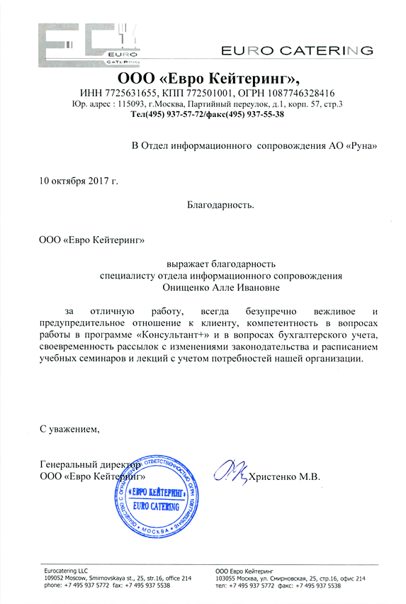 ООО «Евро Кейтеринг» выражает благодарность специалисту отдела информационного сопровождения Онищенко Алле Ивановне за отличную работу, всегда безупречно вежливое и предупредительное отношение к клиенту, компетентность в вопросах работы в программе «Консультант+» и в вопросах бухгалтерского учета, своевременность рассылок с изменениями законодательства и расписанием учебных семинаров и лекций с учетом потребностей нашей организации. Христенко М.В.
