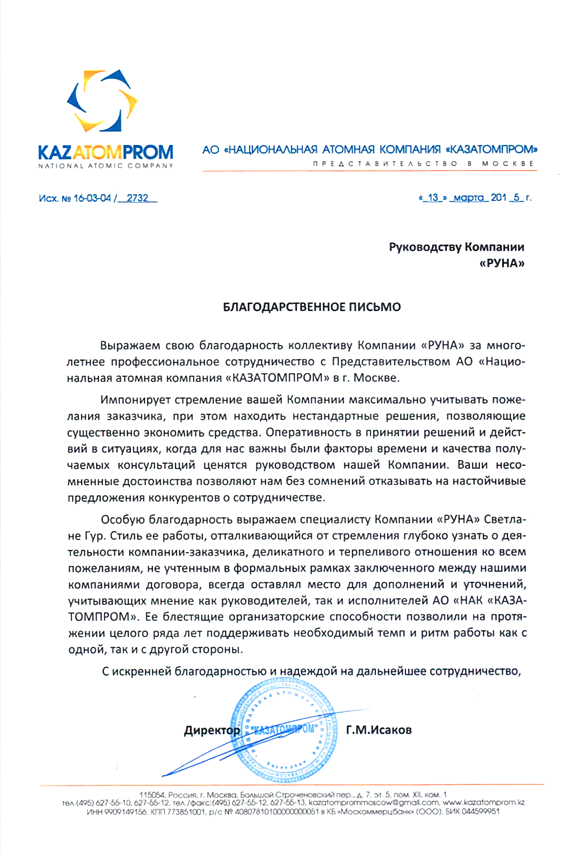 Выражаем свою благодарность коллективу компании «РУНА» за многолетнее профессиональное сотрудничество с Представительством АО «Национальная атомная компания «КАЗАТОМПРОМ» в г. Москве. Импонирует стремление вашей компании максимально учитывать пожелания заказчика, при этом находить нестандартные решения, позволяющие существенно экономить средства. Оперативность в принятии решений и действий в ситуациях, когда для нас важны были факторы времени и качества получаемых консультаций ценятся руководством нашей Компании. Ваши несомненные достоинства позволяют нам без сомнений отказывать на настойчивые предложения конкурентов о сотрудничестве. Особую благодарность выражаем специалисту Компании «Руна» Светлане Гур. Стиль ее работы, отталкивающийся от стремления глубоко узнать о деятельности компании-заказчика, деликатного и терпеливого отношения ко всем пожеланиям, не учтенным в формальных рамках заключенного между нашими компаниями договора, всегда оставлял место для дополнений и уточнений, учитывающих мнение как руководителей, так и исполнителей АО «НАК «КАЗАТОМПРОМ». Ее блестящие организаторские способности позволили на протяжении целого ряда лет поддерживать необходимый темп и ритм работы как с одной, так и с другой стороны. С искренней благодарностью и надеждой на дальнейшее сотрудничество. Исаков Г.М.