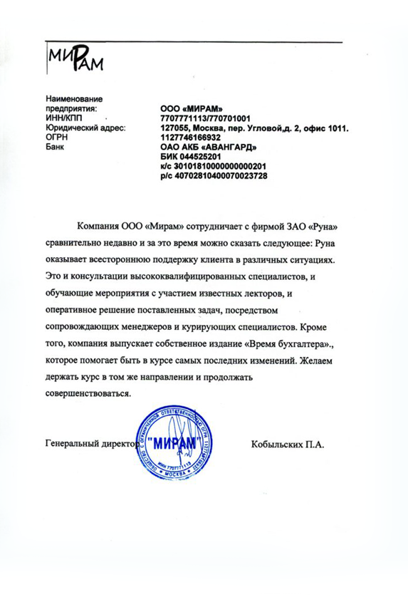 Компания ООО «Мирам» сотрудничает с фирмой ЗАО «Руна» сравнительно недавно и за это время можно сказать следующее: Руна оказывает всестороннюю поддержку клиента в различных ситуациях. Это и консультации высококвалифицированных специалистов, и обучающие мероприятия с участием известных лекторов, и оперативное решение поставленных задач, посредством сопровождающих и курирующих специалистов. Кроме того, компания выпускает собственное издание «Время бухгалтера», которое помогает быть в курсе самых последних изменений. Желаем держать курс в том же направлении и продолжать совершенствоваться. Кобыльских П.А.