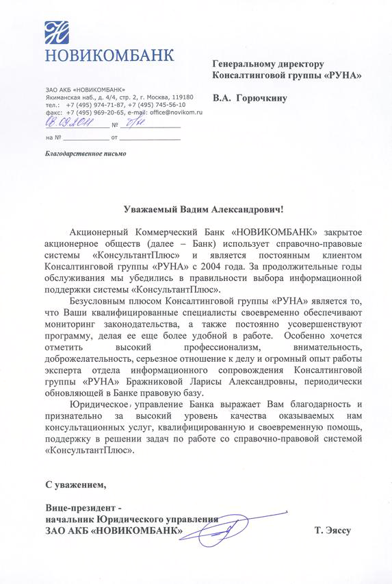 Акционерный Коммерческий Банк «НОВИКОМБАНК» закрытое акционерное общество (далее — Банк) использует справочно-правовые системы «КонсультантПлюс» и является постоянным клиентом Консалтинговой группы «РУНА» с 2004 года. За продолжительные годы обслуживания мы убедились в правильности выбора информационной поддержки системы «КонсультантПлюс». Безусловным плюсом Консалтинговой группы «РУНА» является то, что Ваши квалифицированные специалисты своевременно обеспечивают мониторинг законодательства, а также постоянно усовершенствуют программу, делая ее еще более удобной в работе. Особенно хочется отметить высокий профессионализм, внимательность, доброжелательность, серьезное отношение к делу и огромный опыт работы эксперта отдела информационного сопровождения Консалтинговой группы «РУНА» Бражниковой Ларисы Александровны, периодически обновляющей в Банке правовую базу. Юридическое управление Банка выражает Вам благодарность и признательно за высокий уровень качества оказываемых нам консультационных услуг, квалифицированную и своевременную помощь, поддержку в решении задач по работе со справочно-правовой системой «Консультант Плюс». Эяссу Т.