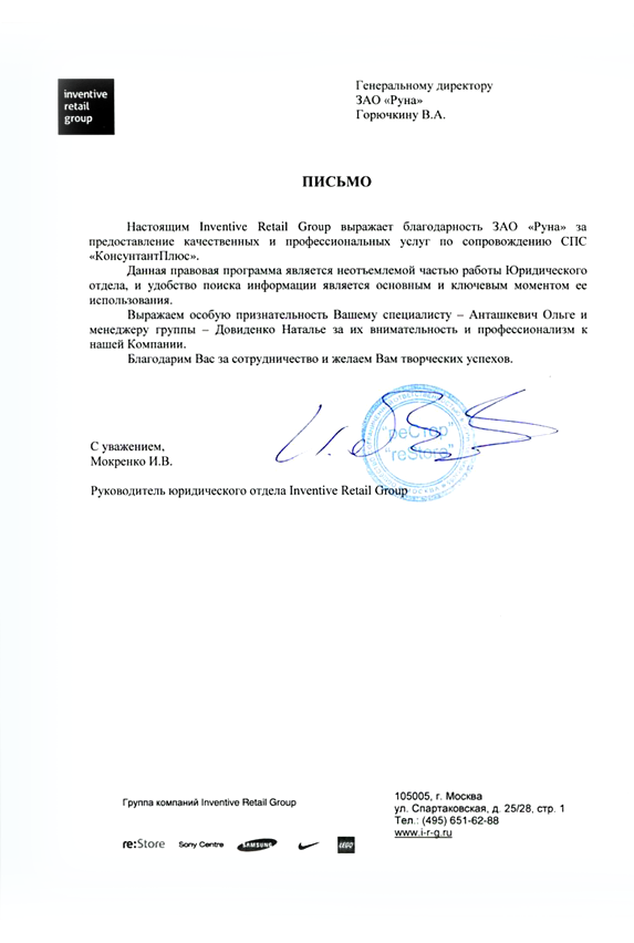 Настоящим Inventive Retail Group выражает благодарность ЗАО «Руна» за предоставление качественных и профессиональных услуг по сопровождению СПС «КонсультантПлюс». Данная правовая программа является неотъемлемой частью работы Юридического отдела, и удобство поиска информации является основным и ключевым моментом ее использования.Выражаем особую признательность Вашему специалисту — Анташкевич Ольге и менеджеру группы Довиденко Наталье за их внимательность и профессионализм к нашей Компании. Благодарим Вас за сотрудничество и желаем Вам творческих успехов. Мокренко И.В.