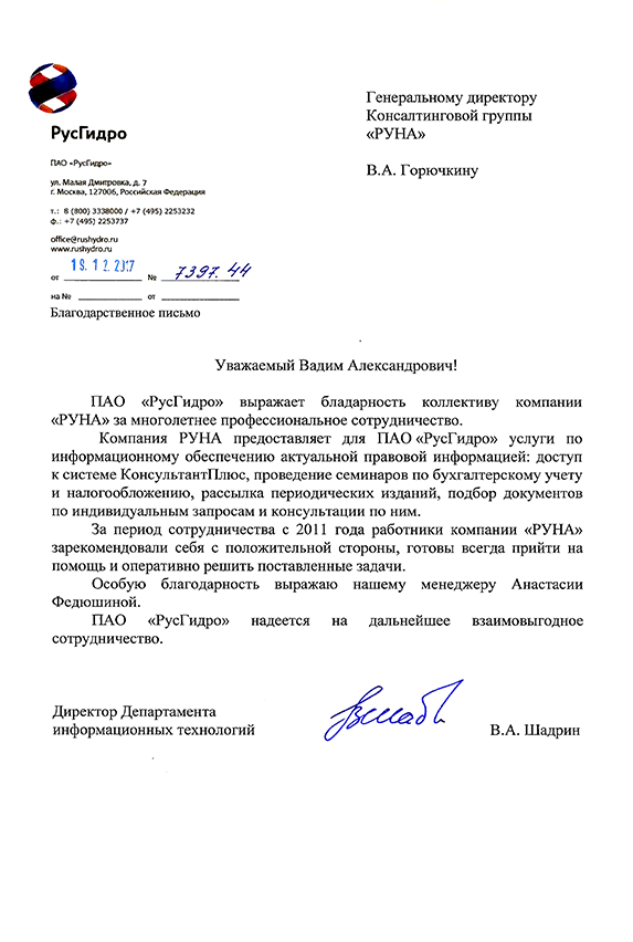 Уважаемый Вадим Александрович! ПАО «РусГидро» выражает благодарность коллективу компании «РУНА» за многолетнее профессиональное сотрудничество. Компания РУНА предоставляет для ПАО «РусГидро» услуги по информационному обеспечению актуальной правовой информацией: возможность пользоваться системой КонсультантПлюс, проведение семинаров по бухгалтерскому учету налогообложению, рассылка периодических изданий, подбор документов по индивидуальным запросам и консультации по ним. За период сотрудничества с 2011 года работники компании «РУНА» зарекомендовали себя с положительной стороны, готовы всегда прийти на помощь и оперативно решить поставленные задачи. Особую благодарность выражаю нашему менеджеру Анастасии Федюшиной. ПАО «РусГидро» надеется на дальнейшее взаимовыгодное сотрудничество. Шадрин В.А.
