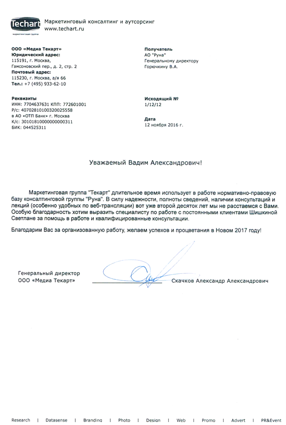 Маркетинговая группа «Текарт» длительное время использует в работе нормативно-правовую базу консалтинговой группы «Руна». В силу надежности, полноты сведений, наличие консультаций и лекций (особенно удобных по веб-трансляции) вот уже второй десяток лет мы не расстаемся с Вами. Особую благодарность хотим выразить специалисту по работе с постоянными клиентами Шишкиной Светлане за помощь в работе и квалифицированные консультации. Благодарим Вас за организованную работу, желаем успехов и процветания в Новом 2017 году. Скачков А.А.