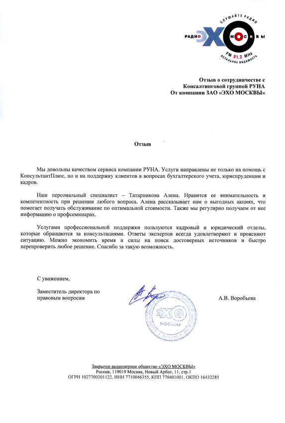 Мы довольны качеством сервиса компании РУНА. Услуги направлены не только на помощь с КонсультантПлюс, но и на поддержку клиентов в вопросах бухгалтерского учета, юриспруденции и кадров. Наш персональный специалист — Татарникова Алена. Нравится ее внимательность и компетентность при решении любого вопроса. Алена рассказывает нам о выгодных акциях, что помогает получать обслуживание по оптимальной стоимости. Также мы регулярно получаем от нее информацию о профсеминарах. Услугами профессиональной поддержки пользуются кадровый и юридический отделы, которые обращаются за консультациями. Ответы экспертов всегда удовлетворяют и проясняют ситуацию. Можно экономить время и силы на поиск достоверных источников и быстро перепроверить любое решение. Спасибо за такую возможность. Воробьева А.В.